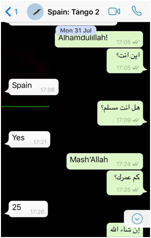 EXEINTEL notó que este sospechoso en particular señalaba indicadores claves de apoyo a la ideología Yihadista. La siguiente es la conversación entre el sospechoso y los agentes de inteligencia.