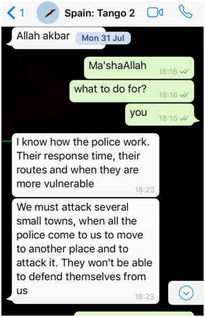 Debemos atacar varios pueblos pequeños (y) cuando todos los policías vengan a por nosotros desplazarnos a otro lugar y atacarlo. No serán capaces de defenderse de nosotros (...) sé cómo trabaja la Policía. Su tiempo de respuesta, sus rutas y cuándo son más vulnerables”, revela supuestamente el terrorista Yunes Abu Yakub en sus mensajes.