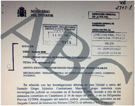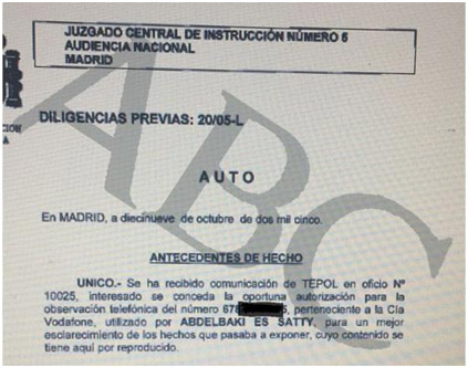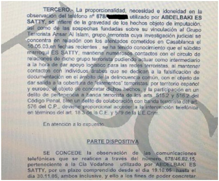 El magistrado autorizó la intervención telefónica en un auto dictado el 19 de octubre de 2005 con este razonamiento jurídico: «La proporcionalidad, necesidad e idoneidad en la observación del teléfono 678... utilizado por Abdelbaki es Satty se infiere de la gravedad de los hechos objeto de imputación, así como las sospechas fundadas sobre su vinculación al Grupo Terrorista Ansar Al Islam».