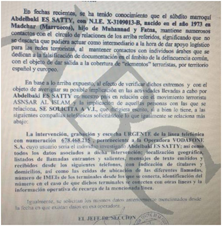 Fernando Grande-Marlaska añadía que Es Satty «puede actuar como intermediario a la hora de dar apoyo logístico para las redes terroristas, al mantener contactos con ciudadanos árabes que se dedican a la falsificación de documentación en el ámbito de la delincuencia común, con el objetivo de dar cobertura a la salida de elementos terroristas por territorio español y europeo».