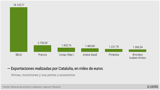 Entre los clientes principales de Cataluña se encuentran Estados Unidos (18,1 millones de euros), Francia (2,7 millones), la República del Congo (1,8 millones) o, en cuarto lugar, Arabia Saudí (1,5 millones), que tras los atentados de Cataluña ha protagonizado los mensajes contra el Gobierno o el Rey por sus relaciones con este país.