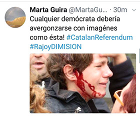 Algunas de las imágenes que pretenden ilustrar la violencia policial del 1-O tampoco son de esta jornada, sino de protestas anteriores. Por ejemplo, la de un joven ensangrentado que fue atacado, supuestamente, por una pelota de goma. La fotografía original es la misma, pero en realidad se corresponde con las cargas policiales contra los mineros que se manifestaron en Madrid en el año 2012.
