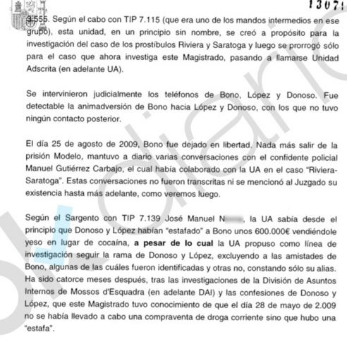 Un sargento de los Mossos, José Manuel N., explicó al juez que la Unidad Adscrita de Trapero “sabía desde el principio” que la recogida del alijo era un engaño: Bono había pagado a los dos traficantes 600.000 euros por la droga, y éstos le engañaron entregándole 29 paquetes con yeso. Según el auto del juez Aguirre, el equipo de Trapero había ocultado estos hechos al juez, para proteger a la banda de Carbajo.
