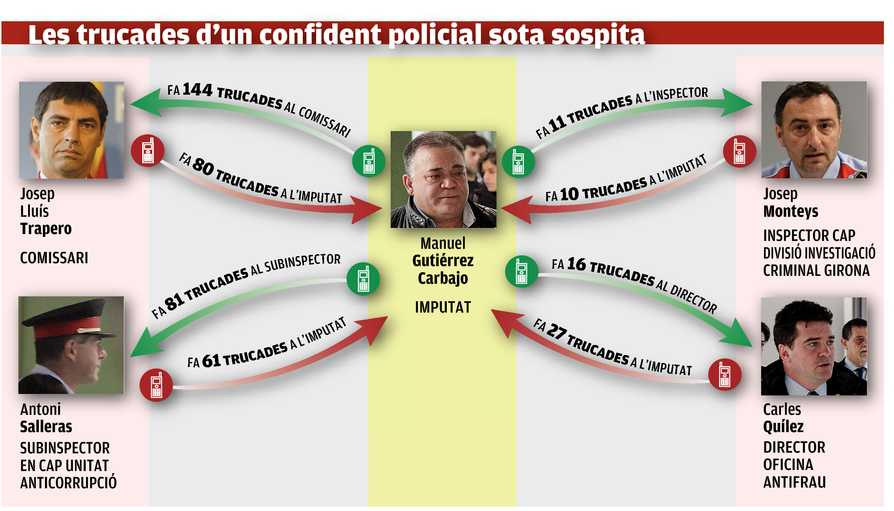 Los informes de los Mossos trasladados a instancias judiciales detallan un nutrido tráfico telefónico. En primer lugar figura el propio Trapero, en aquel momento responsable de la División de Investigación Criminal de los Mossos. El número total de llamadas detectadas procedentes del alto mando policial con destino a Gutiérrez Carbajo se eleva a 80. A su vez, el número de llamadas recibidas por Trapero procedentes del narco alcanza el nada despreciable número de 144 contactos telefónicos. En total, más de 220 llamadas entre el jefe de los Mossos y el narco, en poco más de un año.