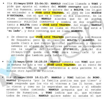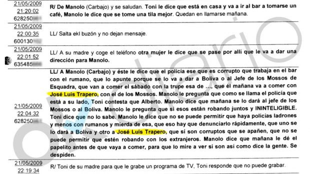 A continuación, el narco afirma que “no se puede permitir que haya policías ladrones y menos con rumanos y mierda de esa, que eso hay que denunciarlo rápidamente, que uno se lo dará a Boliva (sic) y otro a José Luis Trapero. Que si son corruptos, que se apañen, que no se puede permitir que estén robando con los extranjeros”. Según los informes de la Guardia Civil, el “policía corrupto” al que ambos interlocutores aluden era uno de los agentes que formaban parte del operativo de vigilancia contra los narcos.