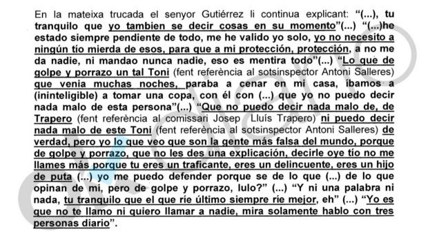 La División de Asuntos Internos de los Mossos transcribió de la siguiente forma las palabras del narcotraficante: “Tú tranquilo que yo también sé decir cosas en su momento… yo no necesito a ningún tío mierda de esos, para mi protección (…) De golpe y porrazo un tal Toni (en alusión al subdirector de los Mossos Antoni Salleres) que venía muchas noches, paraba a cenar en mi casa, íbamos a tomar una copa con él, yo no puedo decir nada malo de esta persona”.