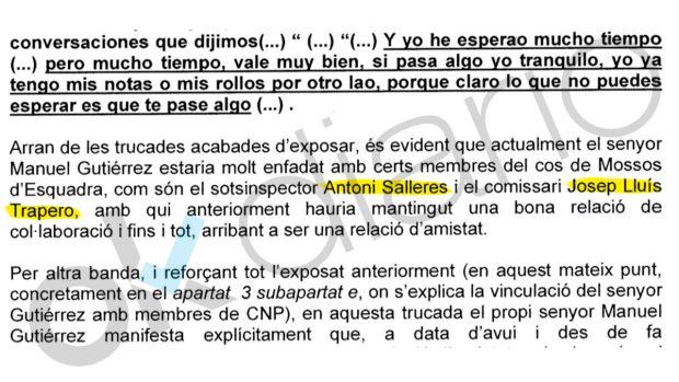 Esto había llevado a la División de Asuntos Internos a incluir el siguiente comentario en otro informe, fechado el 13 de mayo de 2010: “A raíz de las llamadas [telefónicas] que acabamos de transcribir, es evidente que actualmente el señor Manuel Gutiérrez [Carbajo] estaría muy enfadado con ciertos miembros del cuerpo de Mossos d’Esquadra, como el subinspector Antoni Salleres y el comisario Josep Lluís Trapero, con quien anteriormente habría mantenido una buena relación de colaboración e, incluso, llegando a ser una relación de amistad“.