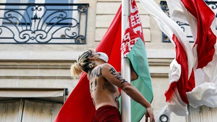 Una payasa de FEMEN en la embajada de Belarús en París, quitando la bandera Belarús para poner la “polaca” de la oposición en su lugar