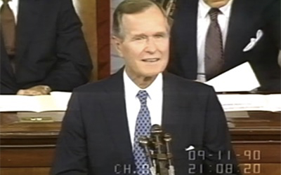 El 11 de septiembre de 1990, el presidente George Bush padre (en la imagen) anuncia, durante una sesión ?conjunta de las dos cámaras del Congreso, el principal objetivo de guerra de Estados Unidos ?en Irak: instaurar un Nuevo Orden Mundial sobre las ruinas de la URSS.?
