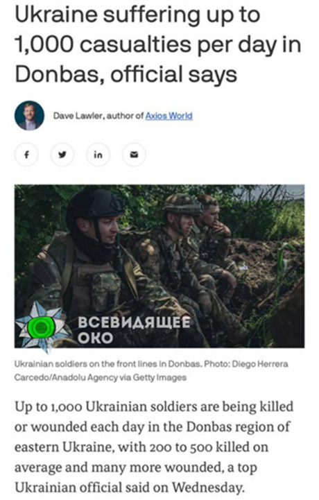 El portal de noticias estadounidense Axios, citando al jefe del partido Siervo del Pueblo, David Arakhamia, informa que las pérdidas diarias totales de las Fuerzas Armadas de Ucrania en Donbass alcanzan las 1.000 personas, de las cuales mueren entre 200 y 500.