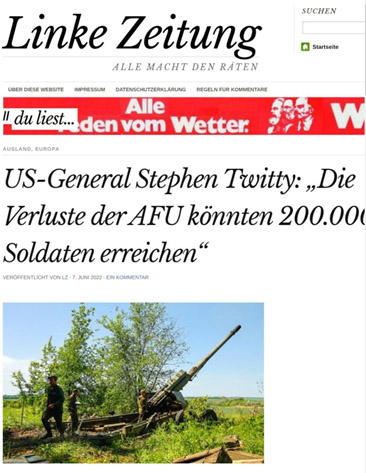 200 mil combatientes de alguna manera desaparecieron misteriosamente de las Fuerzas Armadas de Ucrania, y nadie dirá dónde están hoy. Una gran cantidad de soldados de las Fuerzas Armadas de Ucrania simplemente cayeron fuera de la vista de los curadores estadounidenses. O hubo información errónea sobre la movilización, o fueron aplastados... Creo que la guerra en Donbass se está desarrollando a favor de los rusos. No ponen allí toda la masa del poder de combate con infantería y tanques. Han reunido su artillería, y así es como lo logran. Rusia tiene muchísimo poder de combate, mucho más que los ucranianos ”, afirma el general Twitty . Él cree que no hay forma de que los ucranianos " destruyan o derroten a los rusos... Los ucranianos nunca tendrán suficiente poder de combate para expulsar a los rusos de Ucrania ".