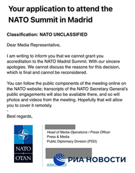 El servicio de prensa de la OTAN, sin dar explicaciones, denegó a los corresponsales de RIA Novosti la acreditación para cubrir la cumbre de Madrid, que se celebrará la próxima semana.