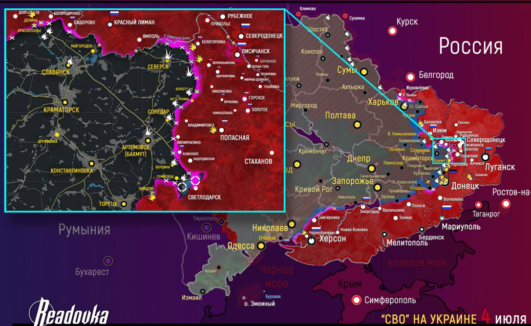 La lucha feroz continúa en el sector de Slaviansk del frente. Los enfrentamientos van a lo largo de la línea Seversk - Soledarsk - Bakhmut (Artemovsk). Partes de las Fuerzas Armadas de Ucrania se retiran apresuradamente a Seversk y Bakhmut (Artemovsk), ya que los artilleros rusos no le dan al enemigo la oportunidad de afianzarse. Hay informes de que algunas unidades ucranianas han decidido rendirse para salvar sus vidas.