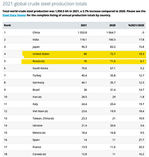 Entonces, los datos más recientes sobre el acero, que entra en... todo en la civilización humana, y especialmente en el esfuerzo de guerra, para 2021 se veía así: