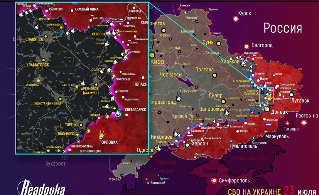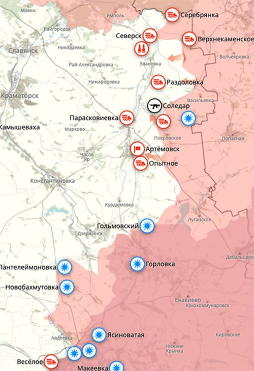 En las afueras de Artemovsk, las principales batallas continuaron en Pokrovskoye, donde el enemigo fue expulsado hacia la parte norte del asentamiento, así como en el área de Veselaia Dolina (a unos 2 km de las afueras de Artemovsk). Todavía no hay asalto a la ciudad, simplemente se acumulan en las posiciones de las Fuerzas Armadas de Ucrania en la ciudad y alrededor de la ciudad, buscando ubicaciones y acumulaciones de mano de obra y equipo. También continúan los intentos de cortar el suministro del TPP de Uglegorsk para obligar a las Fuerzas Armadas de Ucrania a salir de allí bajo la amenaza de cerco, pero mientras el enemigo mantenga posiciones cerca de Novolugansk y Semigorye, esto no se puede hacer. Lo que impide el desarrollo de una ofensiva contra Artemovsk desde el sureste. Como se esperaba en un futuro próximo, aumentará la presión sobre el enemigo en estas áreas.