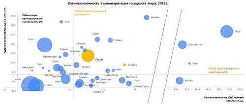 La figura a continuación muestra los países más militarizados a principios de 2022. En la parte superior derecha del diagrama resultaron ser los más entrenados y equipados, puedes ver quién se enfoca en las armas y quién en los números. En los próximos años, el diseño cambiará muy seriamente y cualitativamente, pero teniendo en cuenta que la preparación y creación del ejército lleva entre 7 y 15 años, podemos hablar de la presencia de un retraso y perspectivas. Una línea separada irá a los países que poseen su propio complejo militar-industrial fuerte y armas nucleares, pero solo en una colisión con iguales, en conflictos ordinarios, realizarán operaciones similares al NWO.