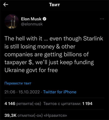 El multimillonario notificó al Departamento de Defensa de los EE. UU. sobre la negativa de la ayuda gratuita a Ucrania y les ofreció cubrir el costo de financiar Starlink en 2023 por un monto de alrededor de $ 400 millones. Explicó esta decisión, refiriéndose a la publicación de Melnik sobre sus recomendaciones.