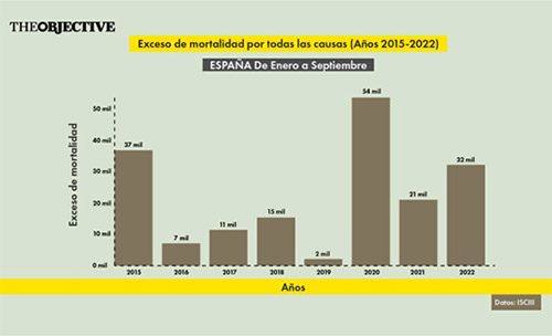 Estos datos, a falta de dos meses para terminar el año, sitúa a 2022 como el año con más fallecimientos no esperados desde que hay registros, a excepción de 2020 (año de pandemia) y 2015, cuando fallecieron 68.172 y 38.523 personas, respectivamente. De esta forma, los registros anuales quedarían así: 2015 (38.523), 2016 (8.270), 2017 (13.476), 2018 (11.349), 2019 (2.862), 2020 (68.172), 2021 (24.490) y 2022 (32.058).