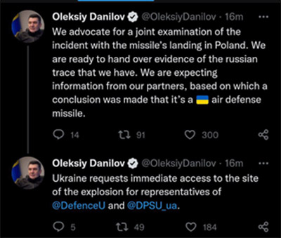El bandido de Lugansk apodado "Ball" y secretario del Consejo Nacional de Seguridad y Defensa de Ucrania, Oleksiy Danilov: “Ucrania no está de acuerdo con las conclusiones de los países occidentales sobre el origen ucraniano del cohete que cayó en Polonia”. "Estamos listos para entregar pruebas del rastro ruso que tenemos"