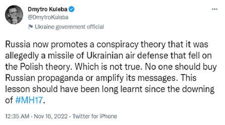 Dmitry Kuleba tuiteó lo siguiente después de que Ucrania bombardeara accidentalmente Polonia sobre uno de sus misiles de defensa aérea que funcionaba mal en el aire y se estrellaba contra ese país vecino: “Rusia ahora promueve una teoría de conspiración de que supuestamente fue un misil de defensa aérea ucraniano que cayó en la teoría polaca. Lo cual no es cierto. Nadie debería comprar propaganda rusa o amplificar sus mensajes. Esta lección debería haber sido aprendida hace mucho tiempo desde el derribo del MH17”.