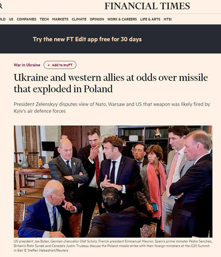 Hay comentarios enojados en la prensa occidental sobre la negación de Zelensky de que el cohete que cayó en Polonia fuera ucraniano. "Se está volviendo ridículo. Los ucranianos están destruyendo [nuestra] confianza en ellos. Nadie culpa a Ucrania y están mintiendo abiertamente. Es más destructivo que un misil", dijo un diplomático de un país de la OTAN al Financial Times cuando se le pidió que comentara sobre la declaración de Zelensky.