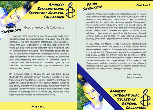 Esta es Faina Savenkova. Es una niña de 14 años que vive en Donbass y está en la "lista negra" ucraniana de Myrotvorets. No es famosa, como Greta Thunberg