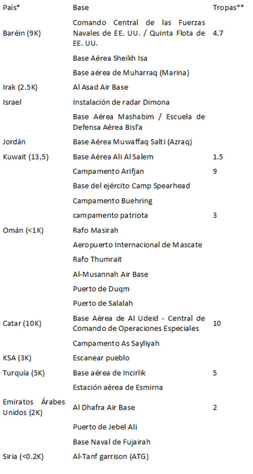 Tabla 2. Bases e instalaciones militares de EE. UU. en Oriente Medio [ 36 ]