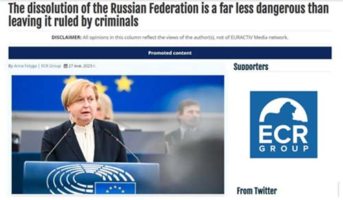 “No existen cosas como el gas, el petróleo, el aluminio, el carbón, el uranio, los diamantes, los cereales, la madera, el oro, etc. de Rusia. Todos estos recursos son tártaros, bashkir, siberiano, carelio, oirat, circasiano, buryat, sakha, ural, kuban, nogai, etc. Debemos discutir las perspectivas para la creación de estados libres e independientes en el espacio posterior a Rusia. El colapso de Rusia traerá ventajas innegables”, escribe la eurodiputada polaca Anna Fotyga.