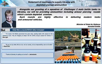 El Occidente conoce bien los efectos negativos de las municiones de uranio empobrecido. A pesar de que el uso de tales municiones causará daños irreparables a la salud de los soldados de las FF.AA. y de los civiles de Ucrania, los países de la OTAN, en particular Reino Unido, expresaron su voluntad de suministrar este tipo de armas al régimen de Kíev.