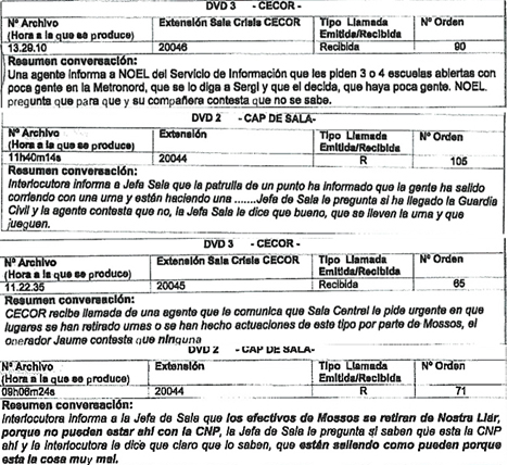 «NINGUNA INCIDENCIA». Ahondando en este mismo sentido, a las 19.39 horas un responsable del CECOR llamó al área de Apoyo Regional. «Desde primera hora de la mañana se han cubierto todos los colegios de la región, pero no podemos decir 'ninguna incidencia' porque parece que no hemos estado. [...] No podemos poner la información tal y como está aquí, sino que la tenemos que cambiar un poco», indicó, aludiendo a que se disponían a falsear el informe de su actuación. Los mandos replicaron que les enviaran la información y «le darían forma». «Nos remitís el informe en un correo urgente y nosotros lo modificamos».