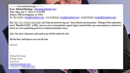 El propio periodista Glen Greenwald del diario The Guardian, quien reveló la red de espionaje de la Agencia de Seguridad Nacional (NSA) a través de su informante Edward Snowden – a la espera de un asilo por parte de Ecuador – recalcó en su Twitter que el último artículo escrito por Hastings había tratado, precisamente, de la NSA.