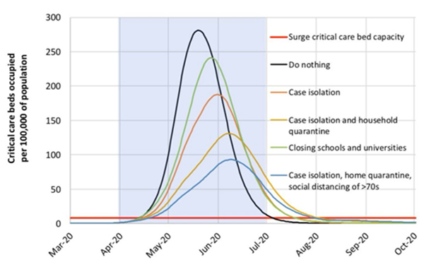 Este gráfico del Imperial College da escalofríos. Las diferentes curvas son diferentes escenarios tomando diferentes medidas. La línea roja (abajo del todo) es la capacidad del sistema sanitario