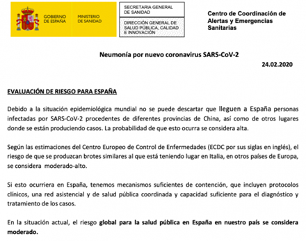 «Según las estimaciones del Centro Europeo de Control de Enfermedades (ECDC por sus siglas en inglés), el riesgo de que se produzcan brotes similares al que está teniendo lugar en Italia, en otros países de Europa, se considera moderado-alto», explicaban los expertos de Sanidad.