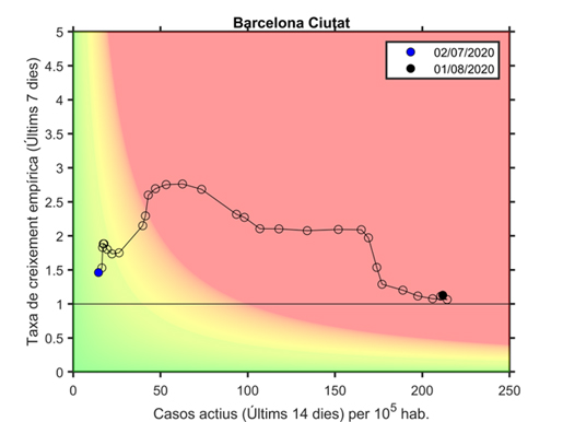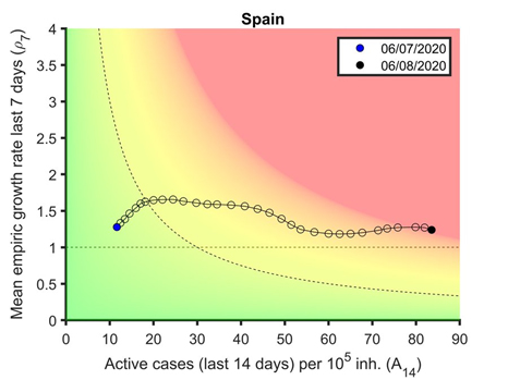 Utilizando el diagrama desarrollado por este mismo grupo y que tiene en cuenta diferentes factores, España se colocó por primera vez en varios meses en la zona roja de riesgo el pasado 6 de agosto y, como explican ellos mismos, esto significa que ya no se puede controlar los brotes solo con rastreadores sino que se necesitan medidas sociales.