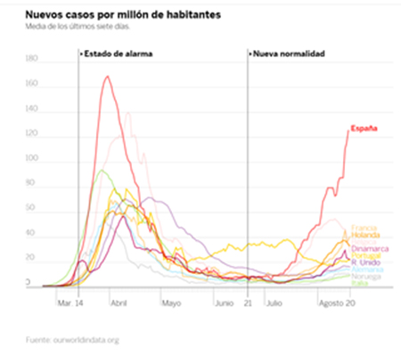 2. Esta segunda ola de coronavirus se observa en otros países europeos, aunque en España es peor (o va por delante). En nuestro país se confirman más infecciones que en ningún otro de la Unión Europea, unos 100 casos diarios por millón de habitantes, según los datos del proyecto Our World in Data, de la Universidad de Oxford. Detrás de España aparecen Rumania (60 casos) y Francia (40), pero la incidencia de momento es mucho más baja en Bélgica (27), Suecia (27), Portugal (20), Reino Unido (15), Alemania (14), Noruega (10) o Italia (9). En todos esos países, no obstante, los casos también están creciendo.