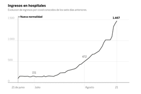 4. Los hospitalizados suben semana a semana. Este viernes la cifra de ingresos en los “últimos siete días” era de 1.467 personas, mientras que la semana anterior fueron 953 y antes 673, 438, 296 y 196. El 9 de junio fueron 150 ingresos, apenas una décima parte. Estos datos del ministerio sabemos que son incompletos, pero la tendencia es preocupante. Además, la podemos confirmar con las cifras de las comunidades que recopila el proyecto Escovid19data: durante la primera quincena de agosto, el total de personas ingresadas pasó de 1.350 a casi 3.000.