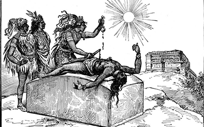 Obviamente, lo primero era la evisceración del corazón para su exposición ante aquel público entregado. Luego, una parrillada en toda regla bien regada de pulque (bebida fermentada a partir del agave) y de la imprescindible marihuana roja, permitía que aquella macabra carnicería se convirtiera en un trance colectivo. Los cadáveres de los interfectos se “cocinaban” al punto y toda la tribu con los sacerdotes al frente, se ponían hasta las trancas. Más tarde, a los cráneos de los interfectos, se les practicaba unas perforaciones circulares en sendas regiones parietotemporales, para finalmente acabar decorando un tzompantli o altar vertical en que se colocaban alineadas las calaveras de los extintos. Como colofón a estos rituales, se acometía una adecuada manipulación post mortem de los cadáveres de tal manera que se practicaba una extracción de los huesos más largos para la obtención de un corolario que con los restos del fenecido se usaban como trofeo a modo de peto hilvanado, objeto muy apreciado como atrezzo de combate.