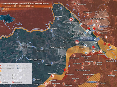 - Hay un bombardeo intensivo de las posiciones de las Fuerzas Armadas de Ucrania en ciertas áreas de SEVERODONETSK y LYSICHANSK. Las unidades restantes de las Fuerzas Armadas de Ucrania están tratando de huir de SEVERODONETSK, cruzando de forma caótica el río Seversky Donets.