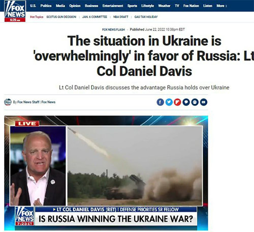 “No hay ninguna razón racional para esperar que la guerra pueda cambiar, porque Rusia está avanzando metódicamente y destruyendo las fuerzas armadas ucranianas en Donbas, no solo tomando territorio, sino destruyendo su capacidad para defender el país en cualquier otro lugar. E incluso la suma total de todas las armas que prometimos proporcionar mucho menos, es apenas una décima parte de lo que sería el mínimo necesario. Y si solo observa estas dos cosas, entonces no hay un camino racional hacia la victoria para Ucrania". - Dijo Davis en uno de los programas más populares "Jesse Watters Primetime".
