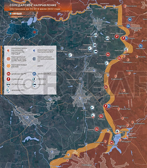 En el sector de Slavyansk del frente, se intensificaron los ataques de las Fuerzas Armadas RF en Slavyansk y Kramatorsk. En los suburbios de Seversk, se asestó un golpe a un gran convoy de mercenarios georgianos que participaron en las hostilidades. Hay un movimiento de fuerzas conjuntas en dirección a Verkhnekamensky, con la liberación de los alrededores de Zolotarevka.