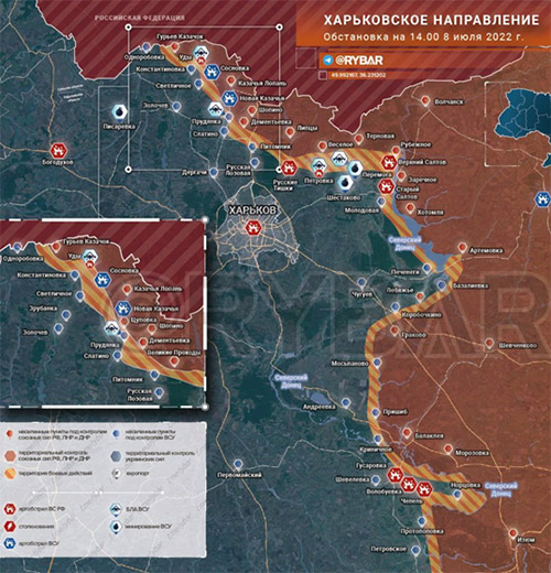 Frente de Jarkov. Las Fuerzas Armadas rusas lanzaron ataques contra las bases de las tropas ucranianas en el norte de la región de Kharkiv. Al norte de Kharkov hay un asalto a Dementievka. Al norte de Slavyansk, la lucha se ha intensificado en Bogorodichne, que ya está casi bajo el control total de los rusos. Para cubrir su izquierda, el Estado Mayor General de las Fuerzas Armadas de Ucrania informó sobre el bombardeo con cohetes y morteros de las fuerzas rusas en el área de la aldea de Mikhalchyna Sloboda en el noreste de la región de Chernihiv.