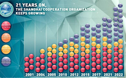 Para dar una idea de su alcance, los participantes en varias capacidades. De hecho, incluye India, Kazajstán, Kirguistán, China, Rusia, Tayikistán, Pakistán y Uzbekistán. Los estados observadores son Afganistán, Bielorrusia, Irán y Mongolia, los socios del diálogo son Azerbaiyán, Armenia, Camboya, Nepal, Turquía y Sri Lanka. Y en la cumbre de 2021 también se puso en marcha el procedimiento para otorgar el estatus de socio de diálogo también a Egipto, Qatar y Arabia Saudí...
