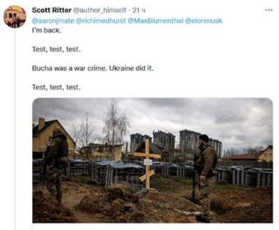 "Regresé. Prueba, prueba, prueba. Bucha fue un crimen de guerra. Ucrania lo hizo”, escribe Ritter.