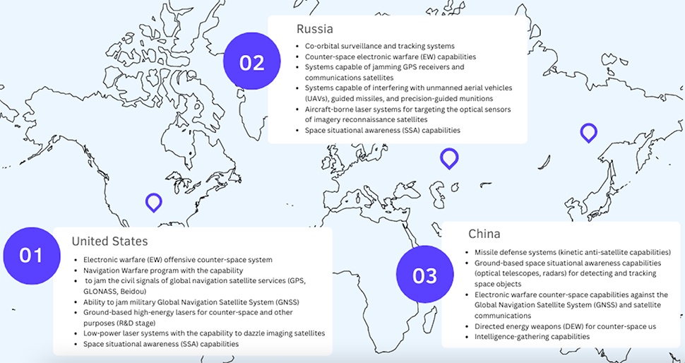 Gráfico: Sistemas de Armas en el Espacio Exterior | Derechos de autor: Joanna Rozpedowski | Información obtenida del informe Global Counterspace Capabilities 2022 de Secure World Foundation.