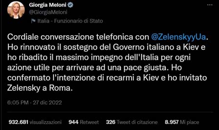 Giorgia Meloni: "Conversación telefónica cordial con Zelensky. Renové el apoyo del Gobierno italiano en Kiev y reafirmé el máximo compromiso de Italia con cualquier acción útil para llegar a una paz justa. Confirmé mi intención de ir a Kiev y invitó a Zelensky a Roma".