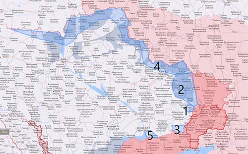 Ya sea simultáneamente con el Teatro 4 o después del movimiento en Kiev (rodeando o preposicionando al norte, oeste y este de Kiev), pudimos ver la apertura de una quinta línea de frente en el sur. El objetivo sería llegar a la ciudad de Zaporozhye. Nuevamente, con el objetivo de sobrecargar los recursos y la logística de Ucrania.