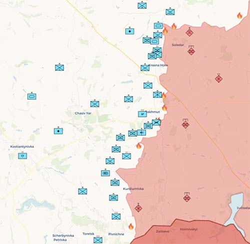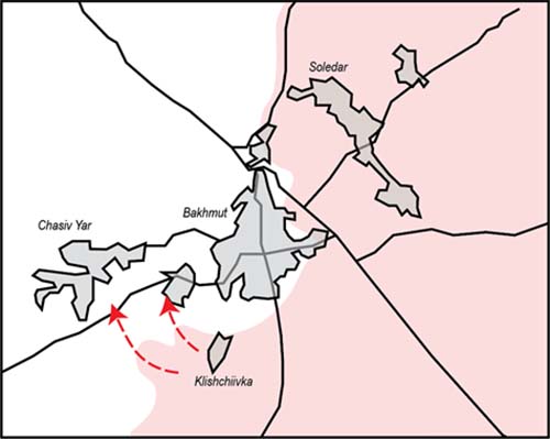 En el momento actual, la posición de Ucrania alrededor de Bakhmut se ha deteriorado gravemente, con las fuerzas rusas (principalmente infantería Wagner apoyada por la artillería del ejército ruso) haciendo progresos sustanciales en ambos flancos de la ciudad. En el flanco norte, la captura de Soledar empujó a las líneas rusas a corta distancia de las carreteras norte-sur, mientras que la captura casi simultánea de Klishchiivka en el flanco sur ha impulsado las líneas del frente al paso de Chasiv Yar (firmemente en la retaguardia operativa de Bakhmut).