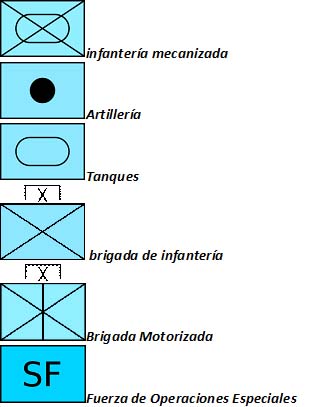 Esto debería ayudarlo a leer y comprender el mapa. Si hay una “X” arriba del recuadro que representa una brigada. Un “III” un regimiento (1000 a 1500 soldados). Un “II” un batallón (300 a 500 soldados).
