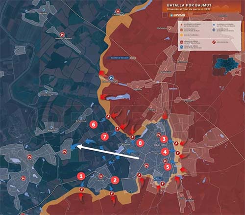 He notado que muchos comienzan a justificar la no retirada ucraniana de Bajmut argumentando que la función de la guarnición es contener el avance ruso (desgastando su potencial ofensivo) mientras se preparan nuevas unidades que participarán en la ofensiva primaveral en dirección Melitopol. Comenzaré diciendo que dudo bastante que la anunciada ofensiva tenga éxito, de producirse puede suponer un grave error estratégico para el mando ucraniano. No observo ninguna razón lógica desde el punto de vista militar por la cual el mando ucraniano estuviese obligado a retener una ciudad sin importancia estratégica como Bajmut. Una retirada organizada a posiciones más ventajosas a lo largo del canal de Chasov Yar habría sido una decisión más acertada. Las tropas rusas habrían sufrido una gran cantidad de bajas de intentar asaltar infructuosamente posiciones elevadas protegidas por el canal de agua (similar a lo ocurrido en Ugledar). Lo más importante es que se habrían conservado una gran cantidad de efectivos altamente preparados para el combate, mientras las tropas rusas se desgastarían en el frente oriental empeñadas en asaltar frontalmente grandes fortificaciones.