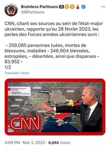 CNN, citando sus fuentes en el Estado Mayor de Ucrania, informa que el 28 de febrero de 2023, las pérdidas de las Fuerzas Armadas de Ucrania ascendieron a: